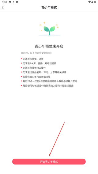 4、在青少年模式说明页面,点击开启青少年模式按钮,完成该模式的开启操作。