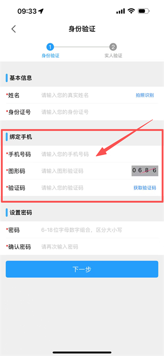 3、在身份验证页,填写您的手机号码、图形验证码及获取的验证码。