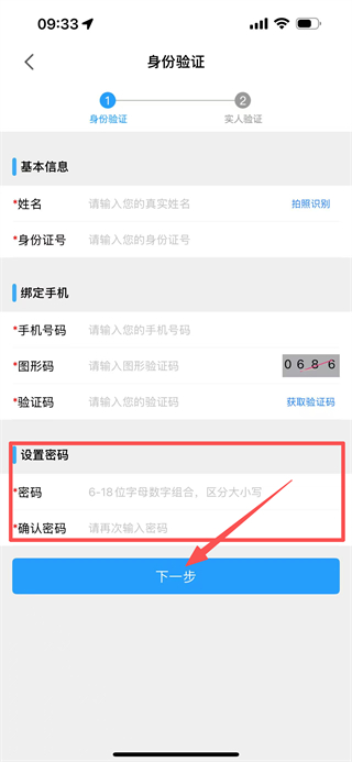 4、在设置密码并填写请再次输入密码,点击下一步,完成后续注册操作。