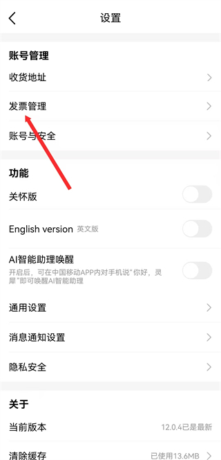 3、在设置页面中,找到发票管理选项并点击,进入发票抬头管理的操作界面。