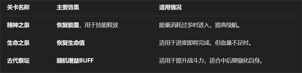 2、增益关卡中,精神之泉优先于能量不足或依赖大招流派;生命之泉在BOSS战前或残血时必选;古代祭坛适合追求爆发输出或特殊机制强化,BUFF选择需结合当前战斗需求。