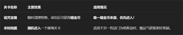 3、特殊关卡中,诅咒宝箱是获取暗金币的唯一途径,无论难度均应优先尝试;未知地图在其他选项收益有限时作为备选,可能提供惊喜资源或隐藏挑战。