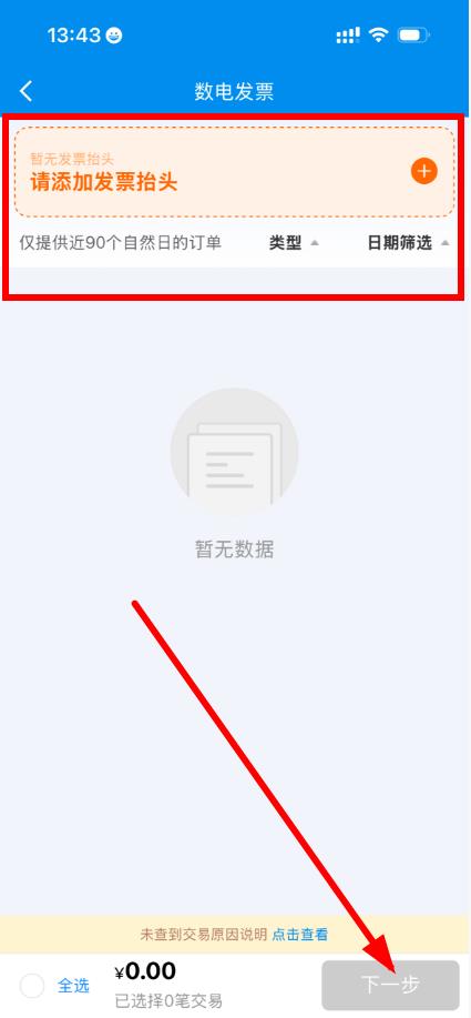 4、点击请添加发票抬头进行添加完成后,点击下一步,按照提示完成发票开具操作。