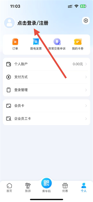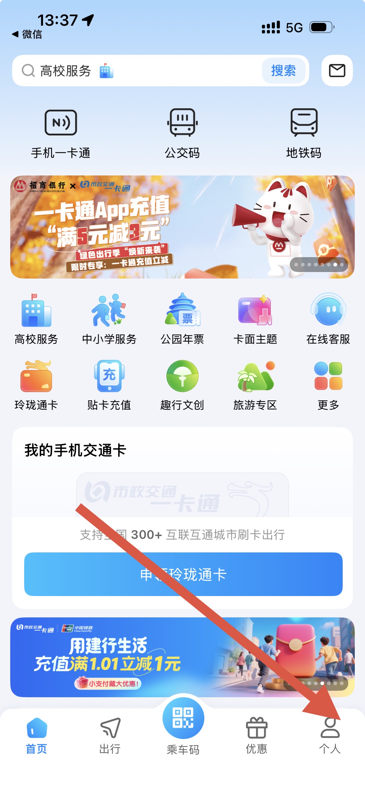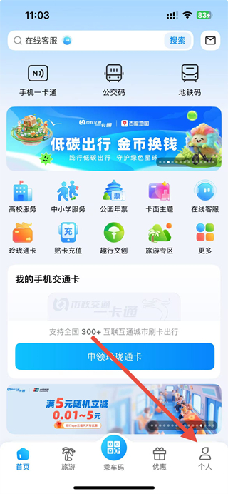 1、在北京一卡通app界面底部,找到个人选项并点击,进入个人页面。