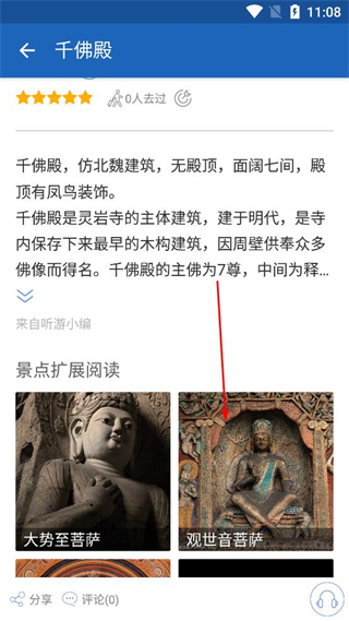 3、在千佛殿详情页找到景点扩展阅读里的观世音菩萨选项,点击该选项,进入对应页面。