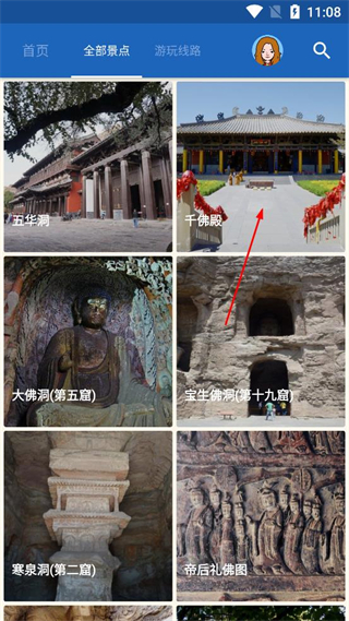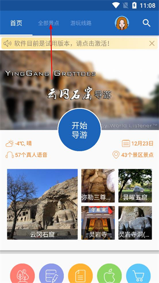1、打开云冈石窟导游应用,在首页找到顶部的全部景点选项,点击该选项,进入景点列表页面。