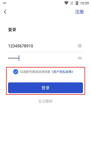 4、勾选代表阅读并同意用户隐私政策的选项,找到登录按钮并点击,完成登录操作。