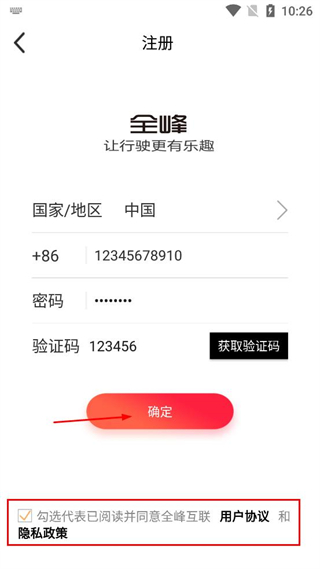 4、勾选代表已阅读并同意的选项,找到确定按钮并点击,完成全峰互联的注册操作。