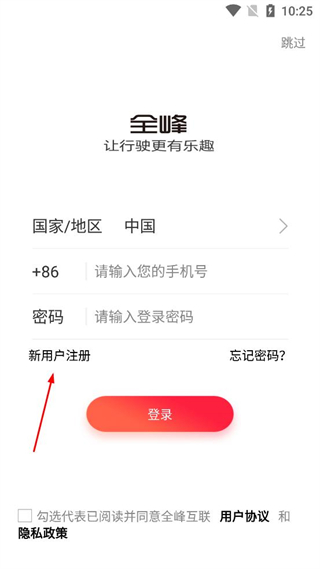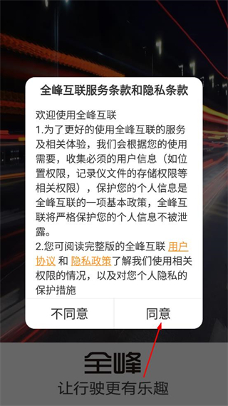 1、打开全峰互联应用,在服务条款和隐私条款页面找到同意按钮,点击该按钮,进入登录页面。