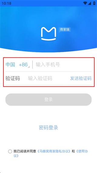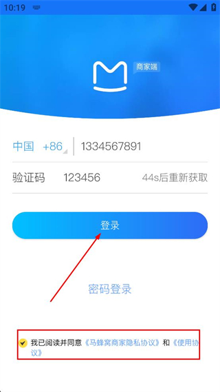 4、勾选我已阅读并同意的选项,找到登录按钮并点击,完成马蜂商家应用的登录操作。