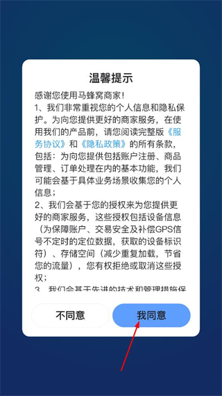 1、打开马蜂商家应用,在温馨提示页面找到我同意按钮,点击该按钮,进入登录选择页面。