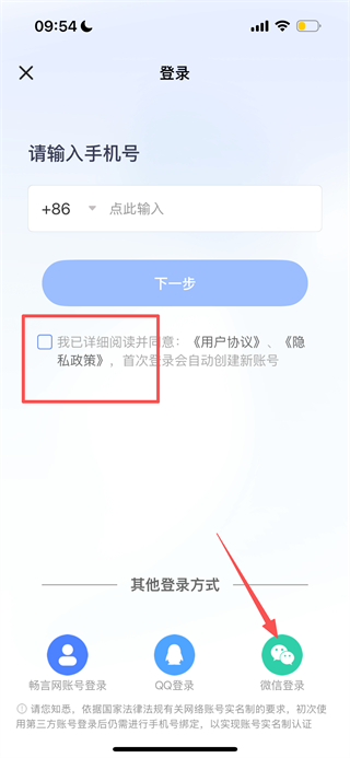 3、在登录页面选择登录方式,勾选协议后完成登录操作。