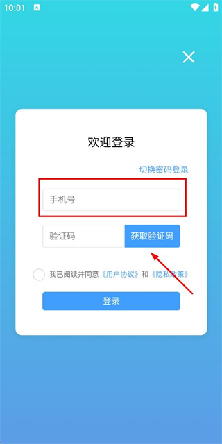 2、在手机登录页面填写手机号,勾选协议后,点击获取验证码。