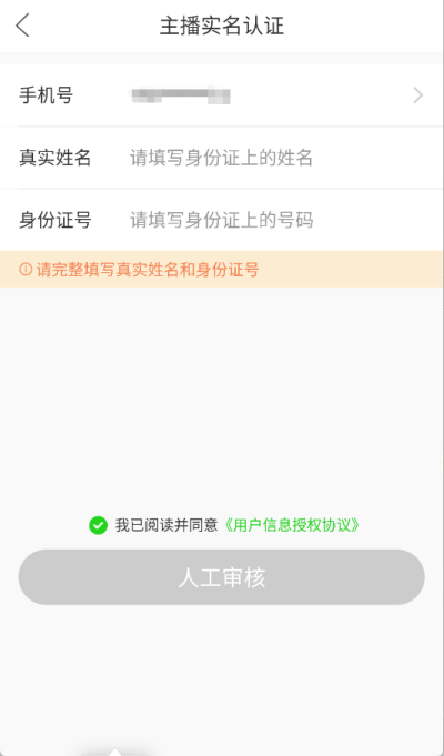 5、最后进入主播实名认证界面,在这里输入自己的手机号、真实姓名以及身份证号即可进行人工审核,审核通过后用户就可以在里面进行开播里。