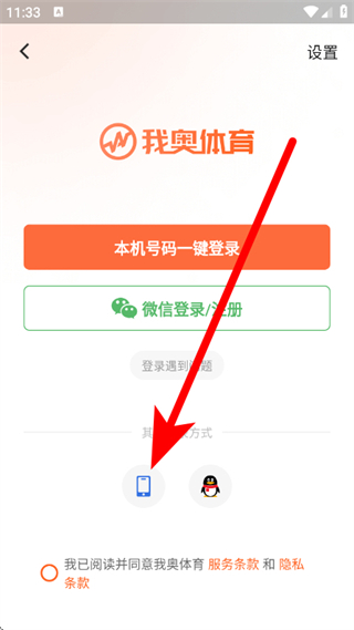 2、在选择登录方式页面,点击手机图标,进入手机登录页面。