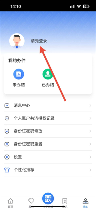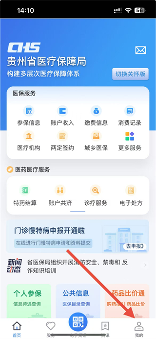 1、打开贵州医保APP后,点击首页底部我的选项,进入我的个人操作界面。