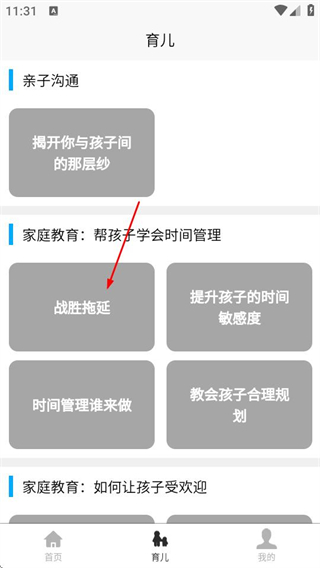 2、在育儿页面选择目标课程内容,进入对应课程列表页。