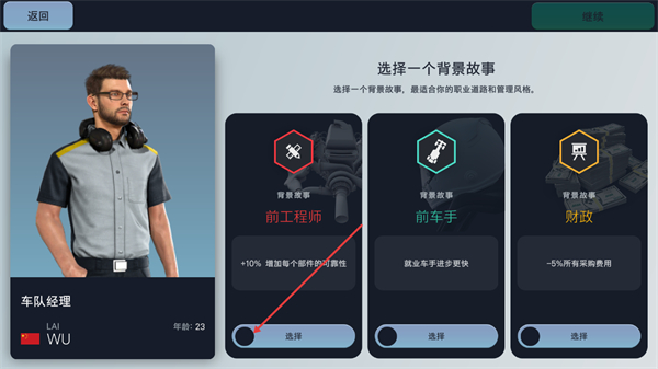 3、在背景故事选择界面可挑选前工程师等背景,选前工程师能获+10%部件可靠性增益,选好后点击对应选择按钮即可。