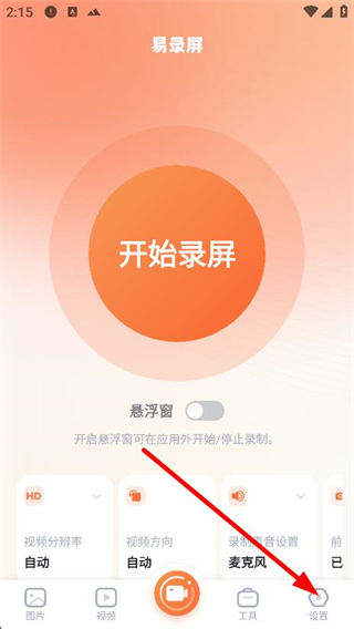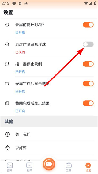 3、点击录屏时隐藏悬浮球的开关,即可完成操作。
