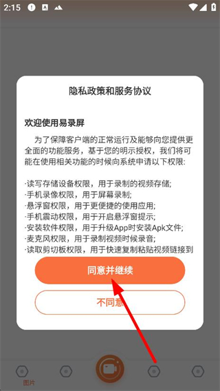 1、打开易录屏app,在弹窗中,点击同意并继续。