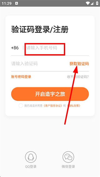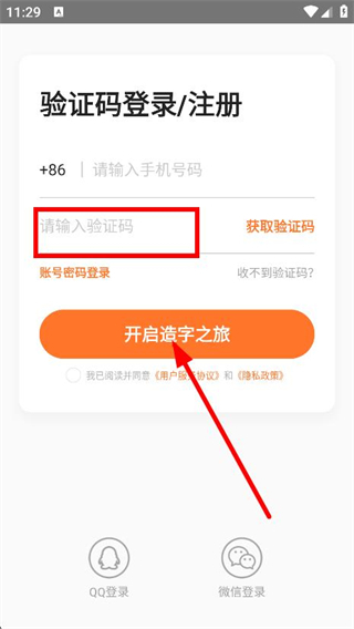 3、填入收到的验证码,点击开启造字之旅,即可完成账号注册。