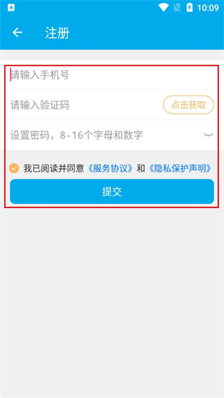 4、输入手机号、获取并填写验证码、设置密码,勾选协议后点击提交。