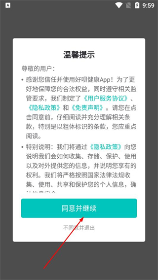 1、打开好呗健康app,在弹出的温馨提示页面点击同意并继续。