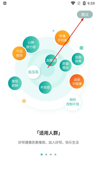 2、进入适用人群介绍页后,点击右上角的跳过。