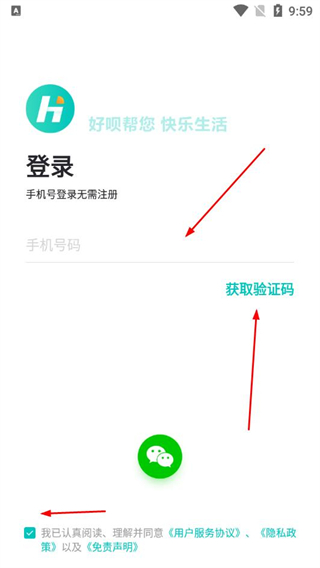 3、进入登录页面后,输入手机号、点击获取验证码并填写收到的验证码,完成账号注册。