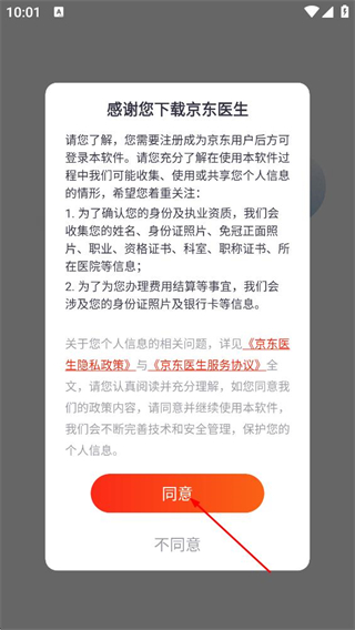 1、阅读京东医生隐私政策与京东医生服务协议后,点击同意,进入应用。