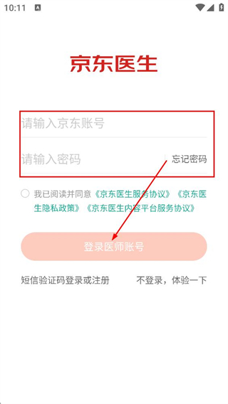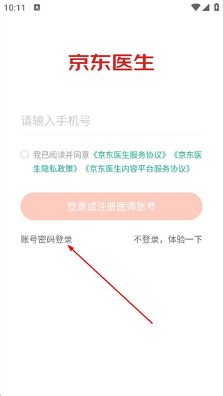 2、在京东医生登录页,点击账号密码登录选项,进入账号密码登录页面。