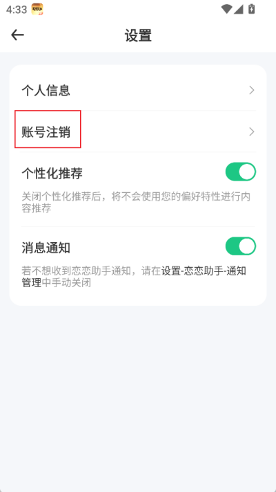 3、进入设置界面后即可看到【账号注销】选项,点击该选项进入注销界面;
