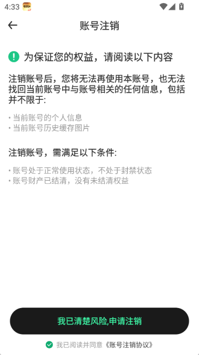 4、进入账号注销界面,在这里可以查看账号注销的注意事项,确认没问题后点击下方【我已清楚风险,申请注销】选项即可。