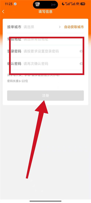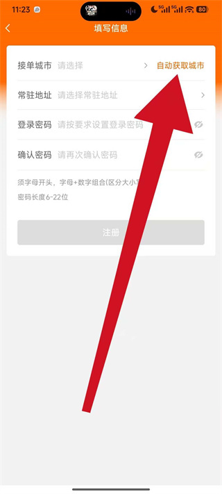 3、进入填写信息页面,点击接单城市旁边的获取城市。