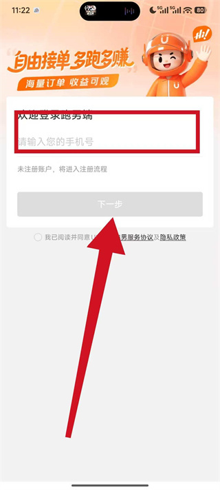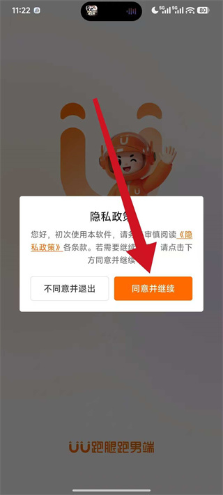 1、打开UU跑腿骑手,在弹出的弹窗中点击同意并继续,进入注册流程页面。