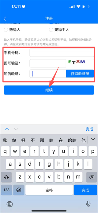 3、填写手机号码、图形验证,获取并填写短信验证后,点击继续来完成后续操作。