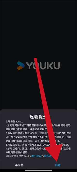 1、打开优酷视频谷歌版,在弹出的弹窗中点击同意,进入应用首页。