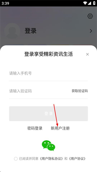3、在登录弹窗中点击新用户注册选项,进入账号注册页面。