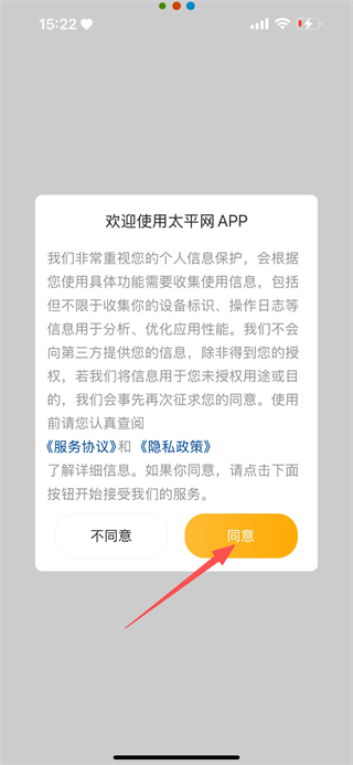1、阅读服务协议和隐私政策后,点击同意按钮,进入太平网APP。