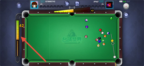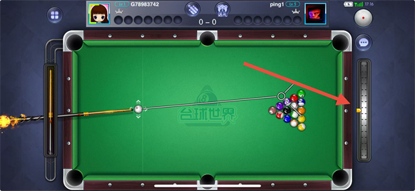 2、进入对局后,通过滑动右侧标尺调整击球力度,力度大小会影响击球后的速度与目标球的移动距离,需根据目标球与袋口的距离合理调整。