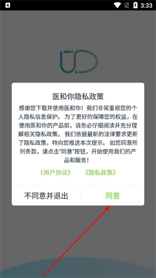 1、打开医和你医生版,在弹出的医和你隐私政策提示框中,点击同意。