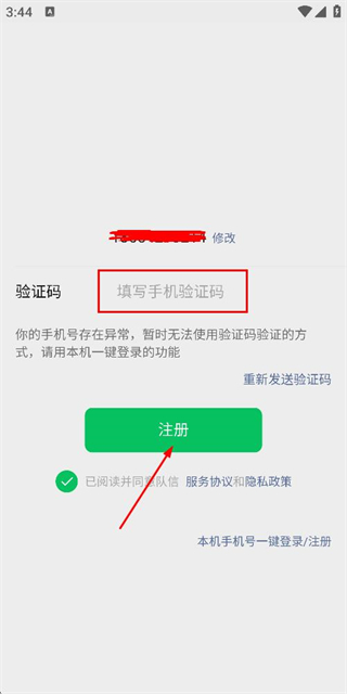 4、在验证码输入页面,输入收到的验证码后点击注册完成操作。