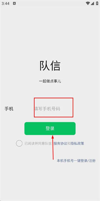 1、在队信登录页面点击其他手机号登录注册选项,进入手机号填写页面。