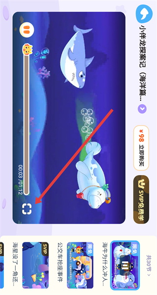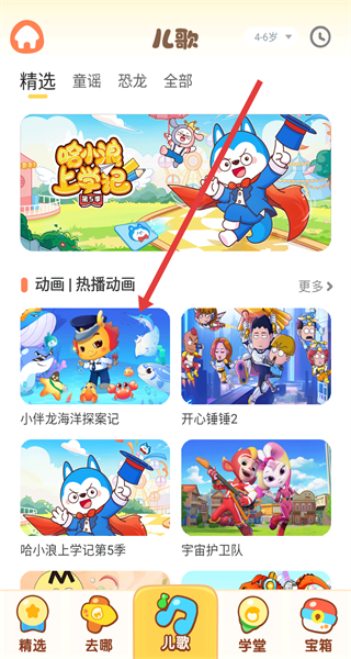 3、在儿歌页面点击“小伴龙海洋探案记”动画,进入播放界面。