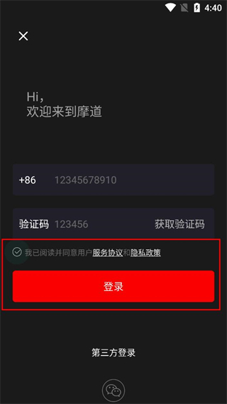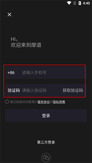 1、打开摩道软件,进入登录页面,在请输入手机号栏填写自己的手机号,然后点击获取验证码按钮。