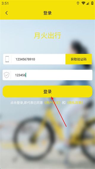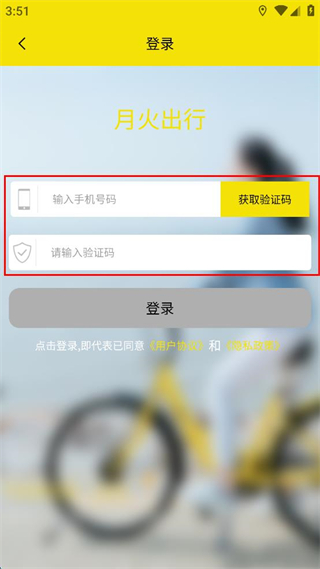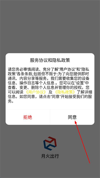 1、打开月火出行软件,阅读服务协议和隐私政策相关内容,确认后点击同意按钮。