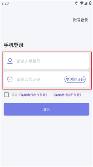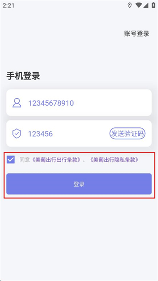 3、勾选同意美葡出行出行条款美葡出行隐私条款的选项,找到页面下方的登录按钮,点击该按钮完成登录。