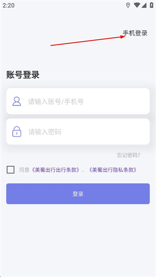 1、进入美葡出行登录页面,找到页面上方的手机登录选项,点击该选项切换至手机登录界面。