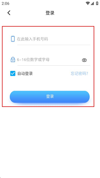 4、注册完成后进入登录页面,依次填写已注册的手机号码和设置好的密码,找到页面下方的登录按钮,点击该按钮完成登录。