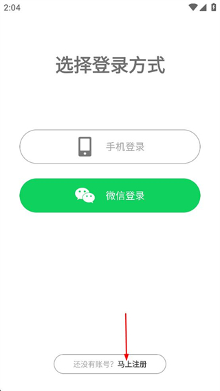 1、打开软件进入选择登录方式页面,找到页面下方的还没有账号?马上注册选项,点击该选项进入注册页面。